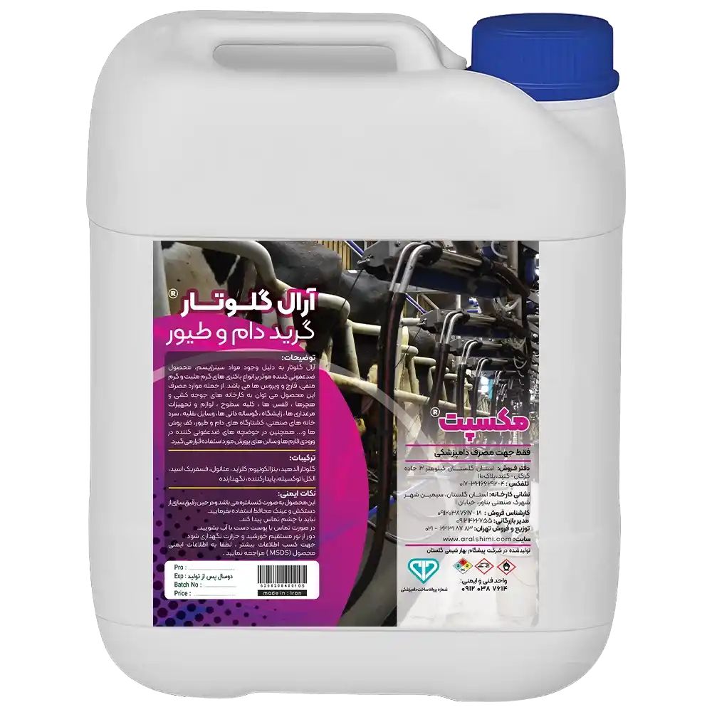 ضدعفونی کننده دام و طیور آرال گلوتار به دلیل وجود مواد سینرژیسم، محصولی ضدعفونی کننده موثر بر انواع باکتری های گرم مثبت و منفی، قارچ ها و ویروس ها است. این محلول بر پایه گلوتار آلدئید صنعتی است و از نظر ضدعفونی کنندگی، سطح بالا به حساب می آید.